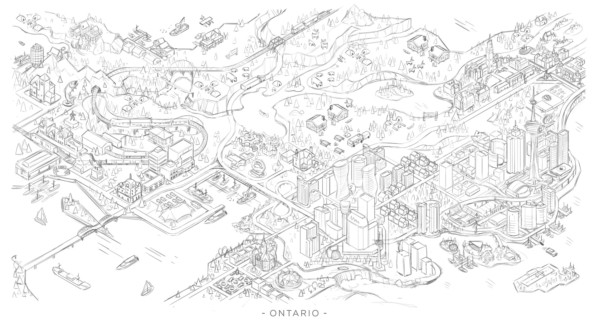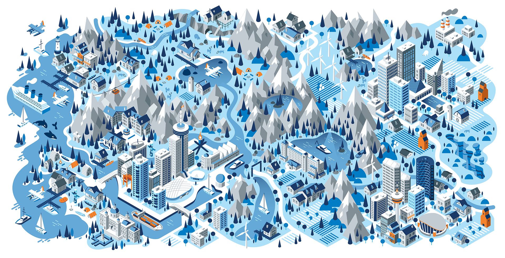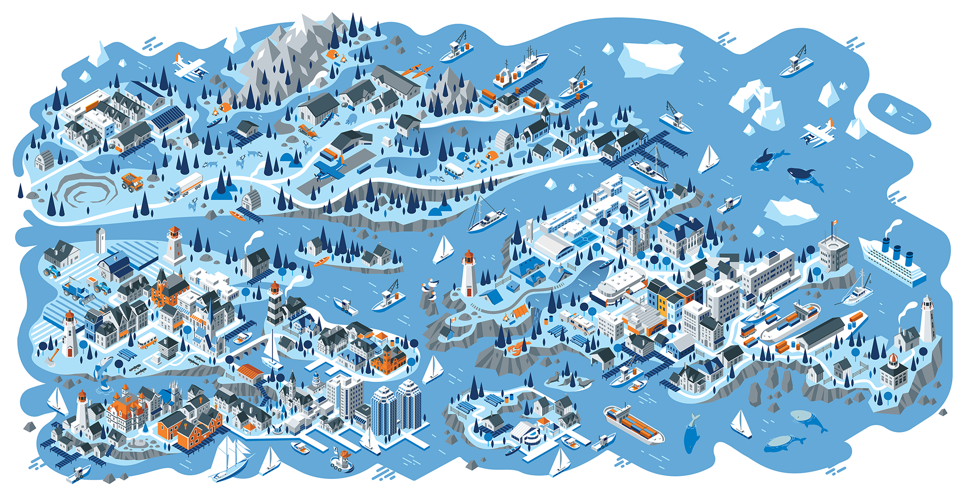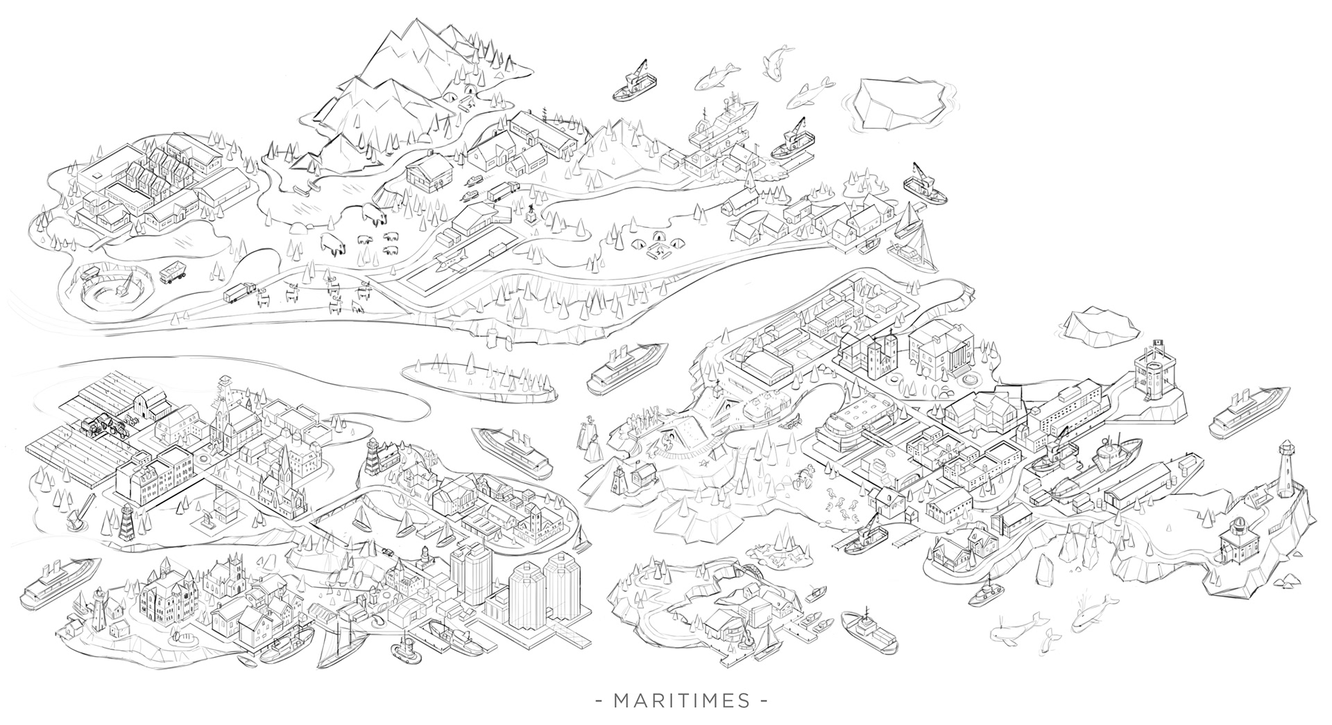 We had a great opportunity to illustrate a series of isometric maps for a current Volkswagen campaign with our friends at Tribal DDB. The illustrations depict 5 regions of Canada, from the west coast to the east coast. A truly fun experience with some wonderfully creative folks.