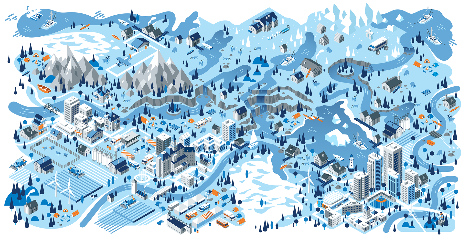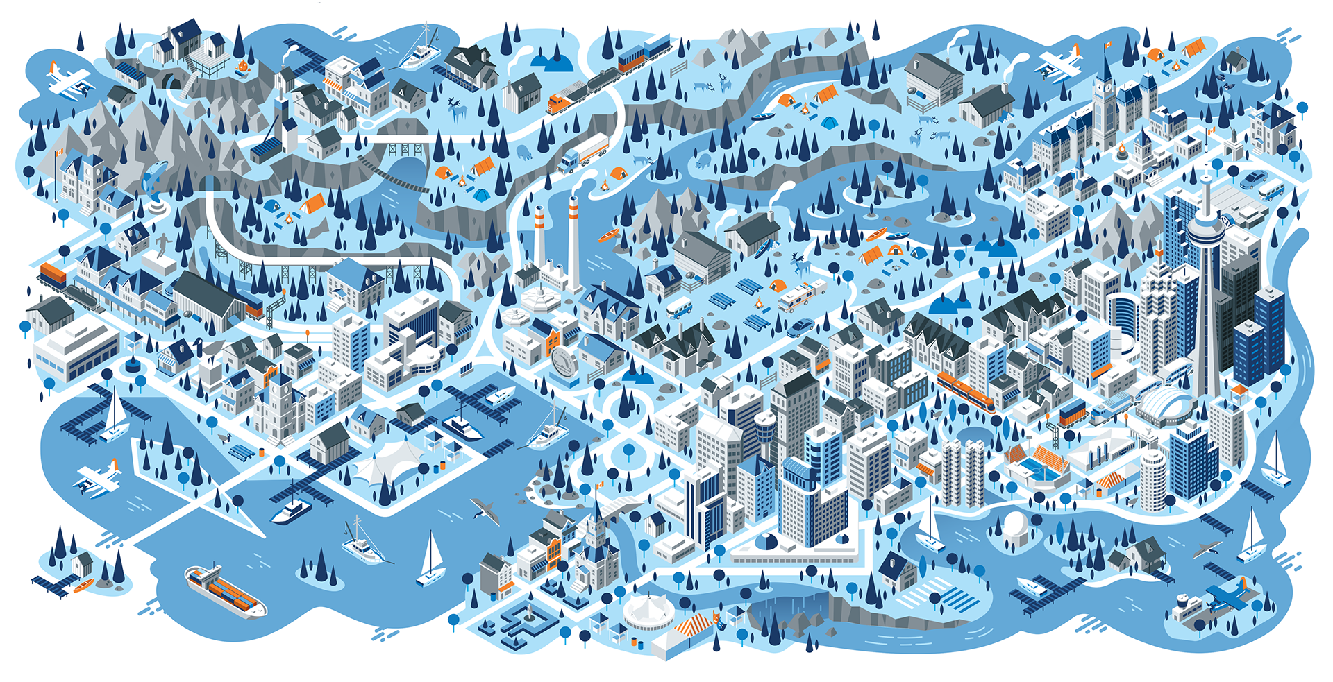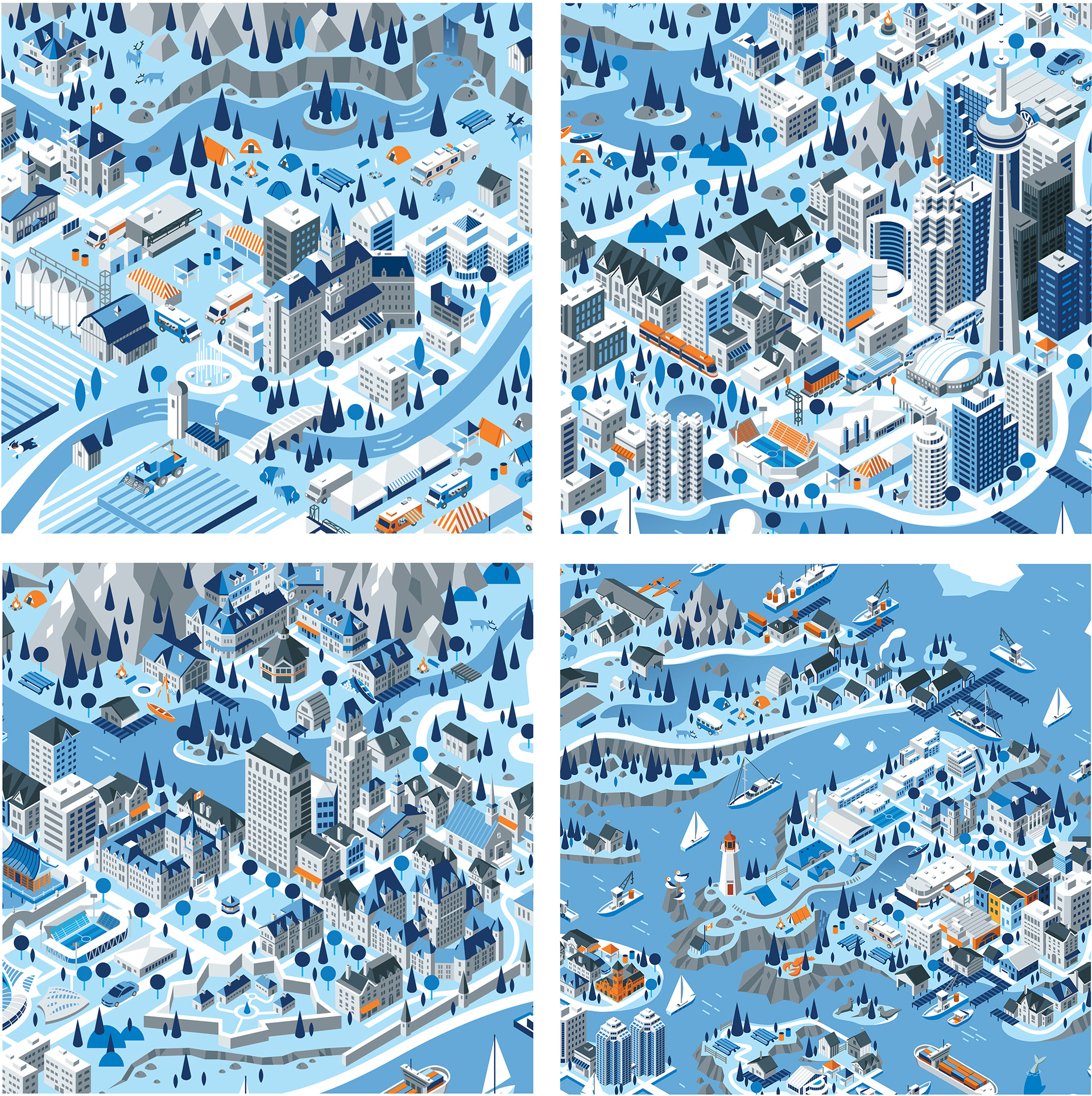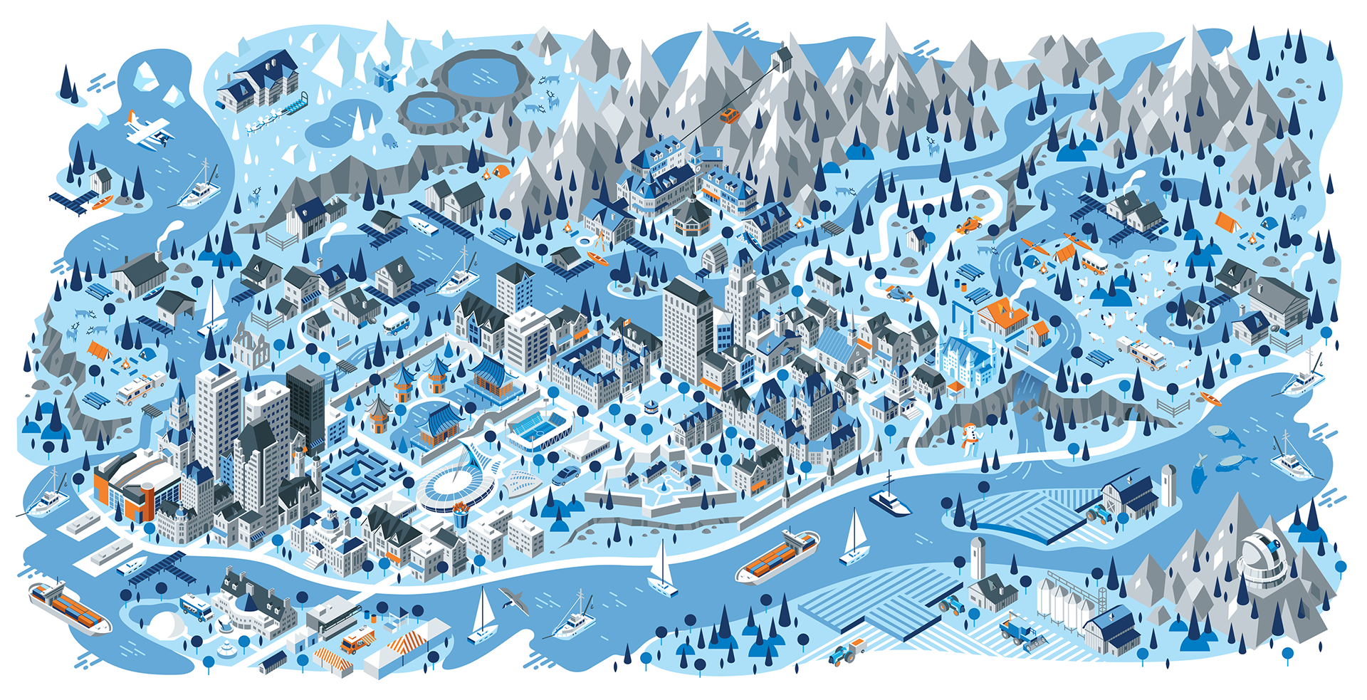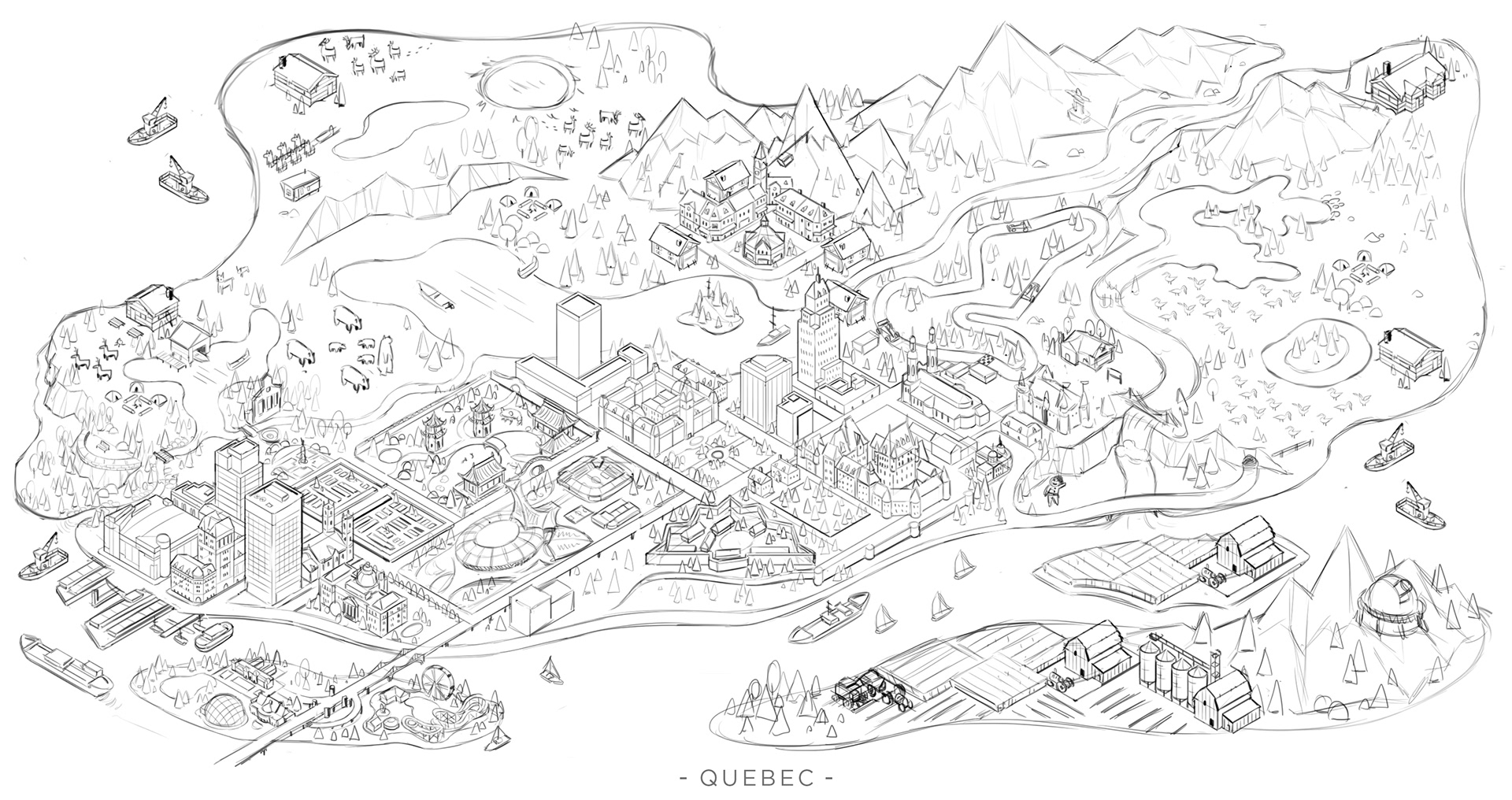 We had a great opportunity to illustrate a series of isometric maps for a current Volkswagen campaign with our friends at Tribal DDB. The illustrations depict 5 regions of Canada, from the west coast to the east coast. A truly fun experience with some wonderfully creative folks.